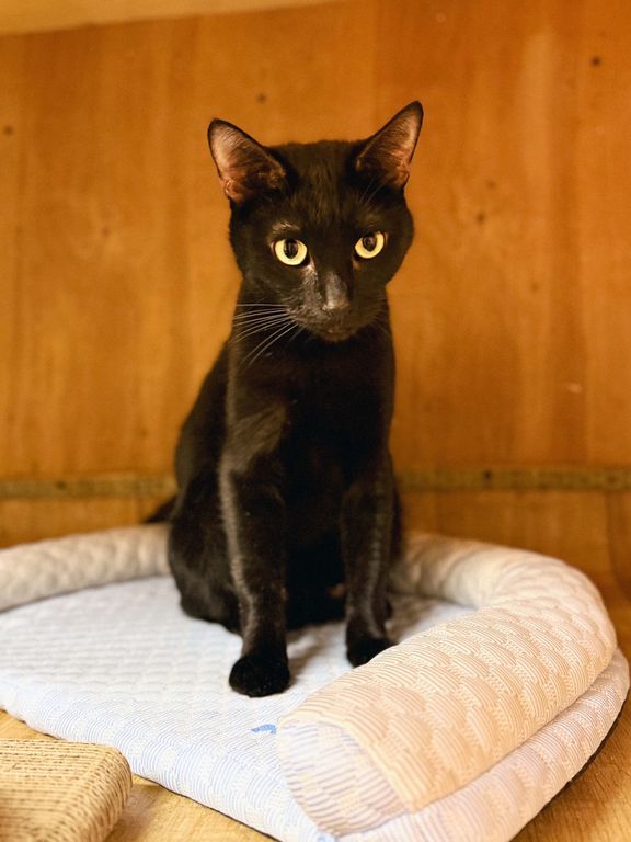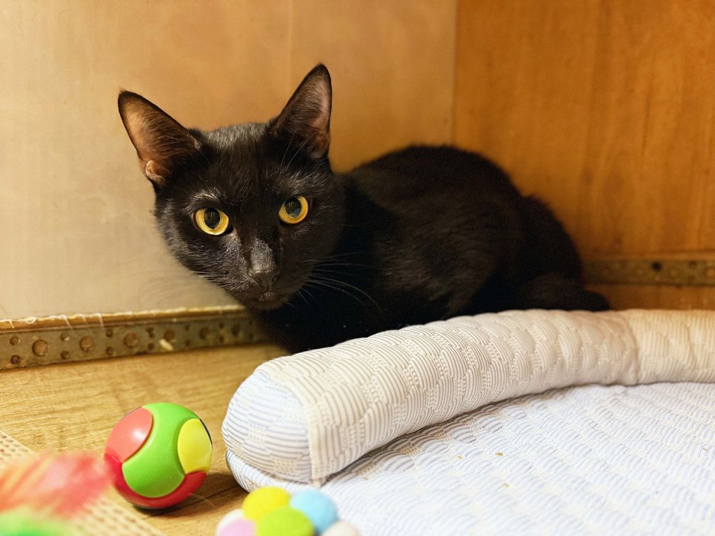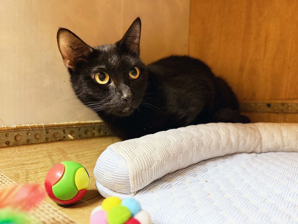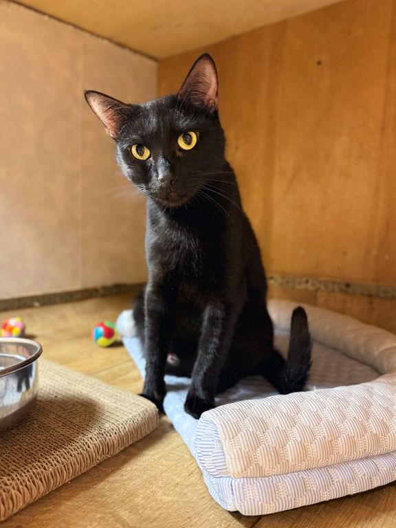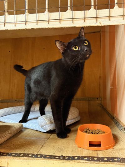 Эмма — нежная черная кошечка примерно 2023 года рождения. В приют она попала в начале сентября 2025 года вместе с двумя такими же черными котиками, Эрнестом и Эриком, которые, возможно, приходятся ей братьями. В тот трудный период у Эммы была лактация, но котят с ней не было, и их судьба осталась неизвестной. Переживая потерю детей, Эмма долго пребывала в стрессе и только недавно, после стерилизации, начала доверять людям. Теперь она с надеждой подставляет мордочку для ласковых поглаживаний, хотя к новым людям может проявлять разумную осторожность.