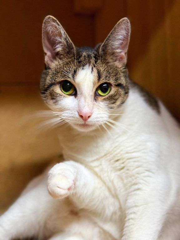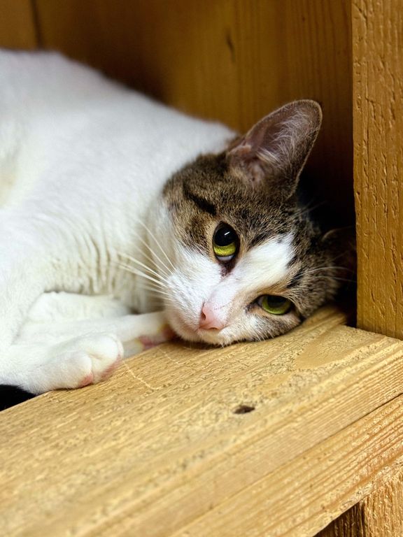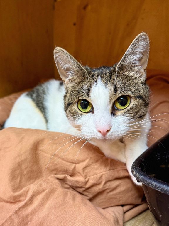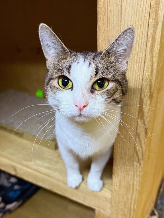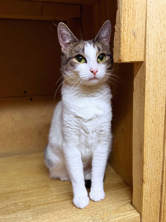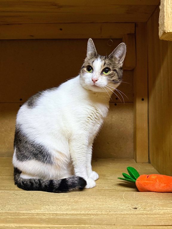 Милка — скромная и ласковая бело-полосатая кошечка, родившаяся примерно в 2017 году. Поздней осенью 2025-го её вместе с ещё двумя кошечками бывшие хозяева оставили замерзать на парковке в закрытых переносках. Попав в приют, Милка поначалу шипела от страха, но быстро освоилась и научилась доверять людям. Теперь Милка сама ищет нежностей, подставляя мордочку для поглаживаний. Но, конечно, с незнакомцами она всё же может справедливо осторожничать — однако быстро сдаётся, почувствовав доброе отношение к себе.